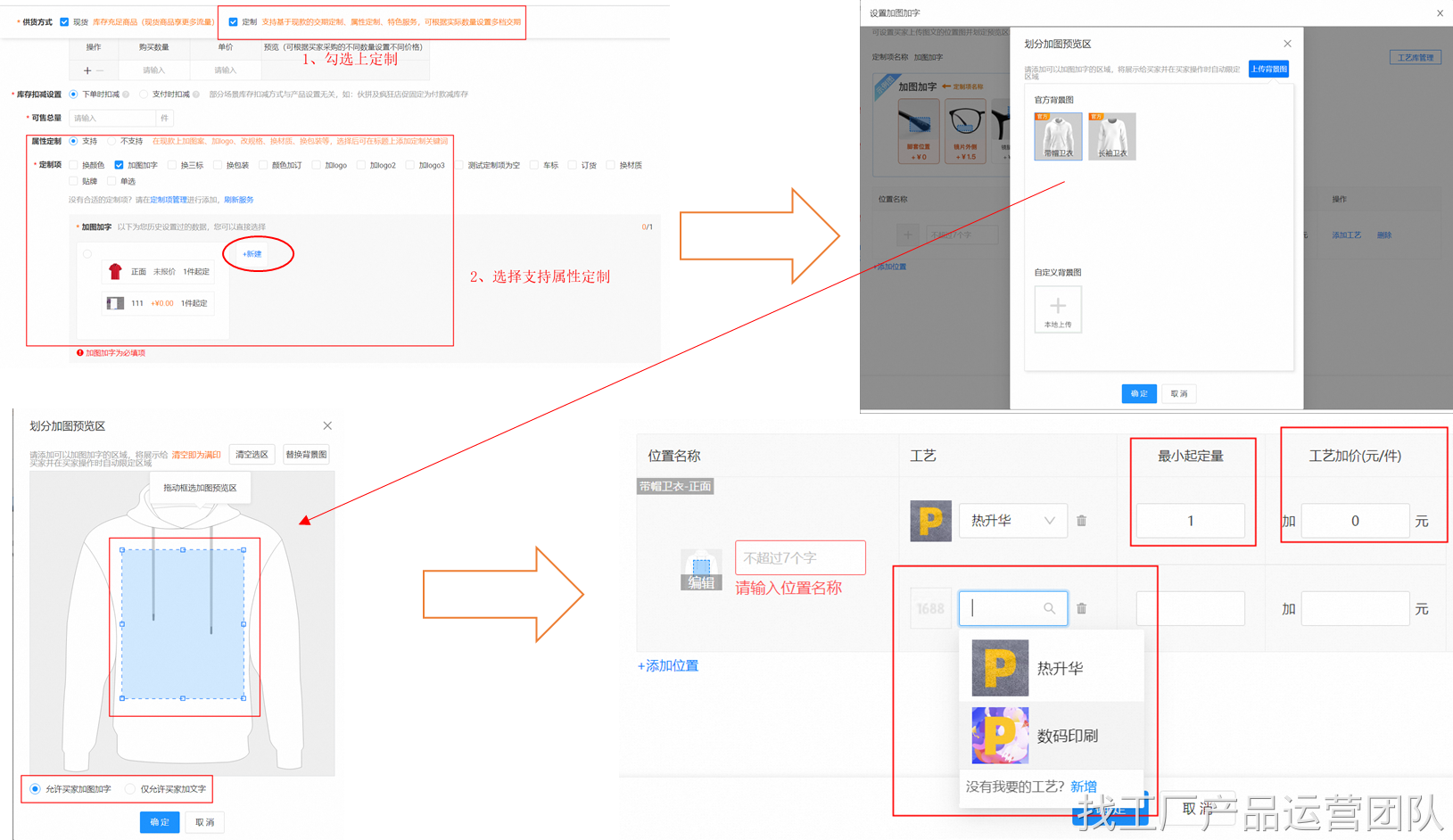 如果發(fā)布定制商品,勾選輕定制,直接拉到最下方進(jìn)行,屬性定制區(qū)域設(shè)置即可;操作方式同上
