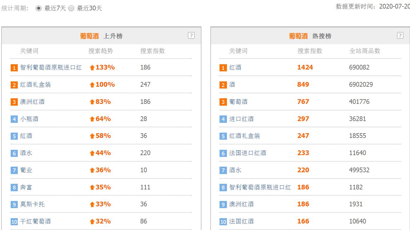 以“法國紅酒”為例,我們可以看到在這個里面關(guān)鍵詞的上升榜和熱搜榜,都對我們選詞非常有幫助。