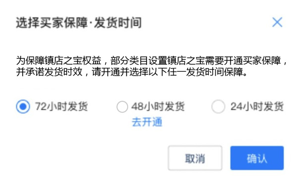 變化點(diǎn)4、鎮(zhèn)店之寶的商品必須開通買家保障服務(wù),同時(shí)需滿足加入24/48/72小時(shí)發(fā)貨保障服務(wù)之一。