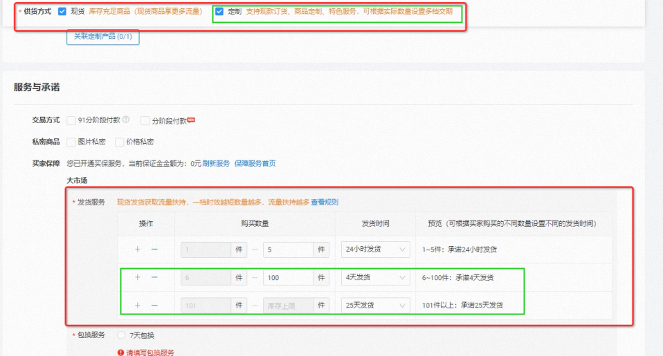 第二步:合理規(guī)范設(shè)置商品定制/現(xiàn)貨品屬性,確保可以在承諾的發(fā)貨時(shí)效內(nèi)規(guī)范發(fā)貨。