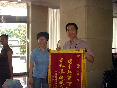 黨辦霍主任(右)代表中心科普基地接受南橋鎮(zhèn)居委朱主任(左)贈予的錦旗