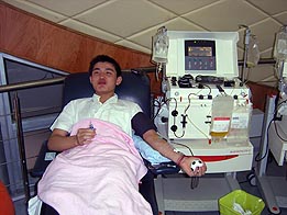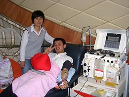 ????? 第二個來做成份獻(xiàn)血的是一名19歲的小伙子,名叫錢龍,曾經(jīng)獻(xiàn)過一次400毫升全血,他今天是特地從曲陽商務(wù)中心過來的,當(dāng)筆者問起為何從那么老遠(yuǎn)趕來獻(xiàn)血?他說,曾經(jīng)有一名無償獻(xiàn)血宣傳員向他介紹過,梅隴獻(xiàn)血屋從6月14日起開始接受成份獻(xiàn)血,當(dāng)時他一口就答應(yīng)了對方。今天特地向公司請假趕過來就是為了履行當(dāng)初的承諾。小錢的性格十分爽朗,他以前是一名運(yùn)動員,身體十分強(qiáng)壯,他說經(jīng)常來獻(xiàn)血也是對自己的一種挑戰(zhàn),他還笑稱通過獻(xiàn)血,以后打針也不怕了。