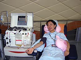 ????? 今天是梅隴獻(xiàn)血屋成份獻(xiàn)血第一天開張,第一位來做成份獻(xiàn)血的人叫劉靜靜,筆者了解到她是一名學(xué)生,在上海理工大學(xué)讀書,本身也是一名無償獻(xiàn)血宣傳員,之前有過一次獻(xiàn)全血經(jīng)歷。今天來是想再獻(xiàn)200毫升全血,當(dāng)工作人員問起為何不獻(xiàn)單采血小板時,她回答說:“前段時間是想獻(xiàn)單采的,但體檢醫(yī)生說我血管太細(xì)不能獻(xiàn)。”經(jīng)過醫(yī)生再次詳細(xì)周密的檢查后,得出結(jié)果是身體各方面狀況完全符合獻(xiàn)單采。劉同學(xué)二話沒說,撩起衣袖,迅速坐上單采椅,整個單采的過程十分順利,一小時左右就完成了。剛獻(xiàn)完單采的劉同學(xué)也沒閑著,又忙著為別的獻(xiàn)血員介紹起無償獻(xiàn)血的知識來,真是活力充沛,年輕無極限??!