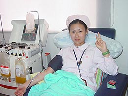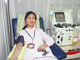 ????? 6月12日,是個(gè)普通的日子,但對(duì)于上海市血液中心單采室隊(duì)伍來(lái)說(shuō)卻是不平凡的一天。就在今天,單采隊(duì)伍中的成員們都紛紛捋袖參加成分獻(xiàn)血獻(xiàn)出了自己的愛心。孫曉芳、范晶晶和姚洋約好一起來(lái)獻(xiàn)單采血小板。因?yàn)槎际堑谝淮螀⒓映煞肢I(xiàn)血,三人都不時(shí)地互相詢問對(duì)方的感受。當(dāng)三朵姐妹花結(jié)束成分獻(xiàn)血分別拿著自己的一袋血小板時(shí),眼中流露著難掩的喜悅。她們一邊相互用照相機(jī)為對(duì)方拍照留念,一邊相約下次還要一起過(guò)來(lái)參加成分獻(xiàn)血。