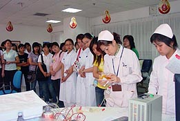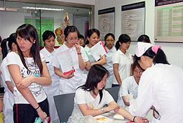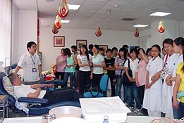 ????? 2007年6月6日上午醫(yī)藥高等專科學(xué)校的三十多位同學(xué)乘坐校車來到上海市血液中心參觀并參加成分獻(xiàn)血體檢。