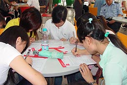 ????? 在社會(huì)事務(wù)科陸瑤和張嘉卿的帶領(lǐng)下同學(xué)們參觀了一樓至三樓的采供血系統(tǒng)。在單采室,在聽了工作人員的介紹和正在單采的獻(xiàn)血者的體會(huì)后,同學(xué)們積極地填寫起成分獻(xiàn)血的登記表。最后,采血室護(hù)士為21位同學(xué)留取了血樣。在這21位同學(xué)中有兩位曾參加過2006年12月的成分獻(xiàn)血,而本次活動(dòng)的組織者陳超同學(xué)則是剛剛滿了全血的間隔期就加入了成分獻(xiàn)血的行列,當(dāng)?shù)弥约旱难“逵?jì)數(shù)是30多萬時(shí),陳超表示:“如果其它指標(biāo)都正常,6月14日這天我獻(xiàn)雙份血小板,這樣我一個(gè)人就能夠救助兩位病人?!?/p>