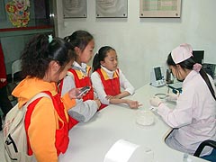 ????? 參觀后小記者們分頭采訪了血庫的幾位工作人員,近距離地與工作人員接觸后小記者們在科普教育基地活動記錄上留下了自己的感言。若干位對血型特別感興趣的同學(xué)也在獻(xiàn)血接待室知道了自己的血型,一位可愛的O型小朋友說到:“我爸爸媽媽都是O型血,今天寧愿手指被扎一針就是為了檢驗(yàn)一下血液中心的檢測水平,結(jié)果令我非常滿意?!碑?dāng)小朋友看到卡通的宣傳海報和宣傳畫時,顯得極為地興奮,每人都想得到一份。