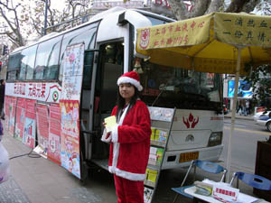 ??????? 為迎接佳節(jié),上海市血液管理辦公室及上海市血液中心共同舉辦了“無償獻(xiàn)血,美好祝福進萬家”活動。在部分采血點安排了圣誕老人配合宣傳,同時進行獻(xiàn)血知識問答,使更多人了解到無償獻(xiàn)血的意義。