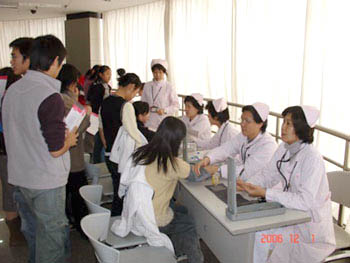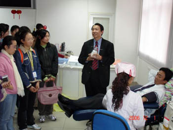 ??????? 2006年12月1日,是第19個(gè)“世界艾滋病日”,上海醫(yī)藥高等??茖W(xué)校的同學(xué)們分別乘坐學(xué)校的大巴和血液中心的專車從南匯校區(qū)出發(fā)去上海市血液中心。下午13:30時(shí),上海市血液中心社會(huì)事務(wù)科的工作人員迎來了遠(yuǎn)道而來的同學(xué)們,接著社會(huì)事務(wù)科的員工分三組帶領(lǐng)同學(xué)們參觀了血庫、采血室、成分室、化驗(yàn)室等采供血流程。當(dāng)同學(xué)們參觀單采室時(shí),他們驚喜地遇到了在臺(tái)灣210次、在上海72次參加成分獻(xiàn)血捐獻(xiàn)血小板的臺(tái)胞陳澤人先生和十多次捐獻(xiàn)血小板的無償獻(xiàn)血志愿者吳健老師。吳健老師又一次捐獻(xiàn)血小板,也給參觀的同學(xué)們談了自己的獻(xiàn)血體會(huì)。陳澤人先生作為嘉賓給同學(xué)們介紹了成分獻(xiàn)血的相關(guān)知識(shí)和臺(tái)灣的成分獻(xiàn)血情況,讓同學(xué)們充分體會(huì)到獻(xiàn)血者的社會(huì)責(zé)任感和捐血救人的奉獻(xiàn)精神。