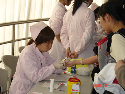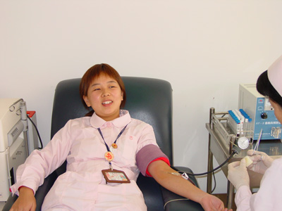 ??????? 上海市血液中心采血室職工徐穎2005年進(jìn)入本中心,她畢業(yè)于楊浦區(qū)衛(wèi)生學(xué)校,曾就職于楊浦區(qū)中心醫(yī)院,過去因為體重不合格,想獻(xiàn)血的愿望一直沒有實現(xiàn)。進(jìn)入中心以來徐穎工作一貫踏踏實實,認(rèn)認(rèn)真真。這次聽說血庫A.O型血緊缺,她想到自己正好是A型血,體重又剛好達(dá)到了獻(xiàn)血標(biāo)準(zhǔn),她二話沒說,在2006年12月1日上午捋袖獻(xiàn)血,雖然她的兒子只有二十個月,雖然不久她還要參加多項考試,但她卻笑笑說:“獻(xiàn)血沒什么,這是我作為中心職工應(yīng)該做的事?!碑?dāng)天下午,上海醫(yī)藥高等??茖W(xué)校的近80位同學(xué)來血液中心參觀,徐穎仍然堅守崗位,盡職盡責(zé)地完成本職工作。
