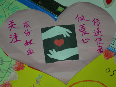 首先,作為活動聯(lián)系人的我親自出了一張關(guān)于成分獻血的海報。海報的主題就是愛心。希望可以用那么多的愛心來吸引同學(xué)們的眼球。讓大家可以參與到成分獻血中來,并且參加我們這個知識講座。接著,還做了40張宣傳單,目的是發(fā)給其他系其他班級的班委,讓他們在班級中宣傳,積極參與到我們的講座中,當(dāng)然也少不了對自己班級同學(xué)的宣傳。最后來參加這個講座的人大約有50人,大家都有興趣了解這方面內(nèi)容的,甚至有部分同學(xué)愿意親自投身進來。