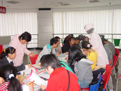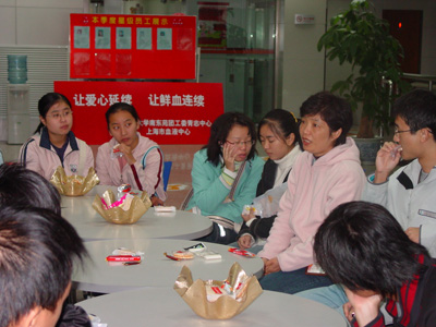 ??? 參觀告一段落,工作人員組織同學(xué)們?cè)诙谴髲d就座,采血室的護(hù)士們已經(jīng)將桌椅排成座談會(huì)的樣式,桌上也放著各式可口的點(diǎn)心和速溶熱飲供同學(xué)們享用。王愛蓮醫(yī)生和張嘉卿和同學(xué)們交流了獻(xiàn)血感受后,有21位同學(xué)踴躍填寫獻(xiàn)血登記表。但是由于有多位女生的靜脈實(shí)在不適合參加成分獻(xiàn)血而被工作人員婉言謝絕,也有同學(xué)捐獻(xiàn)全血后半年間隔期未滿,所以最后參加體檢抽血的有12位同學(xué)。那些女生有點(diǎn)失望,但她們表示,今后還是會(huì)積極參加全血捐獻(xiàn),而且會(huì)向周圍的朋友、同學(xué)宣傳成分獻(xiàn)血。