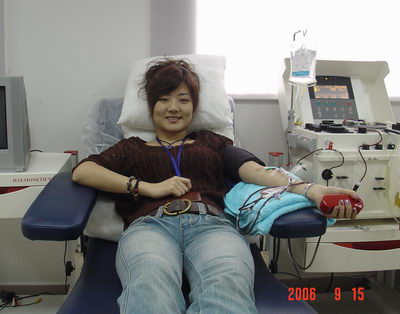 ??????? 2006年9月15日下午,曾三次捐獻(xiàn)全血的上海市血液中心輸血研究所員工、無償獻(xiàn)血志愿者服務(wù)隊(duì)成員高躒選擇成分獻(xiàn)血――單采血小板來紀(jì)念自己30歲的生日。
