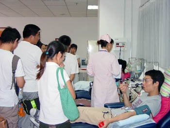??????? ??與其他幾位志同道合的朋友近期一同建立了一個愛心部落,部落中有8位成員于7月27日來到血液中心免疫遺傳室加入中華骨髓庫,其中有4人表示愿意加入獻血者隊伍,??就是其中一位,但由于她當時身份證沒有帶,于是只能看著3位好友在當天獻出熱血????很失望的樣子,事務科員工向她介紹了7月30日將有一個志愿者培訓,要是有興趣可以來參加,那天也可以獻血的。沒想到,部落的成員對這次培訓很感興趣,所以,7月30日上午他們又一行8人一同來到血液中心,參加了培訓后當即決定填表加入中心的志愿宣傳服務隊,最后大家還一同陪??來到二樓采血室,陪伴她完成了心愿!???????????????????????????????????