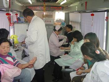 ????? 上海市血液中心也派遣工作人員參加了此次活動,流動采血車前擠滿了志愿參加獻血的市民。其中最為踴躍的是虹口區(qū)公安局的民警和虹口區(qū)社區(qū)衛(wèi)生中心的醫(yī)生護士們。