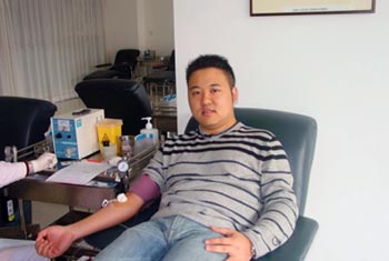 ??????2007年2月25日下午,臺灣朋友戴華方來到血液中心采血室,戴先生早在臺灣就有參加無償獻血的意愿,但是由于工作繁忙一直沒有如愿,如今戴先生來到上海工作,趁著春節(jié)長假他要實現(xiàn)捐血的愿望。向體檢醫(yī)生了解相關(guān)的獻血知識后,雖然是第一次參加無償獻血的戴先生衡量了一下自己的身高體重,還是決定嘗試捐獻400ml全血。在工作人員的全程陪同和指導下,戴華方先生快樂地接受了一次上海市血液中心對他的服務(wù)。