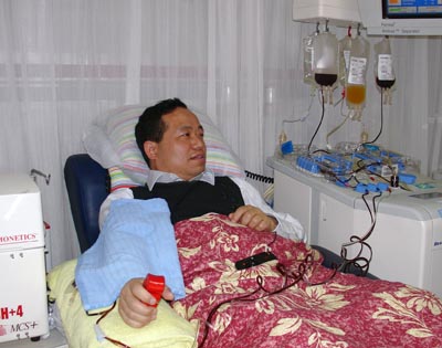 ????? 2007年2月26日,長假結(jié)束的第二天,中心主任朱永明出現(xiàn)在單采室,這是他第三次捐獻(xiàn)血小板。這次,他要嘗試用百特R4R單采機(jī)來做單采。巧的是,單采室的新成員孫培志也選擇在今天第一次獻(xiàn)血小板,領(lǐng)導(dǎo)和普通員工懷著同樣的愛心,一起為倡導(dǎo)成分獻(xiàn)血作出了表率,為期盼的患者送上了一份生命的禮物。